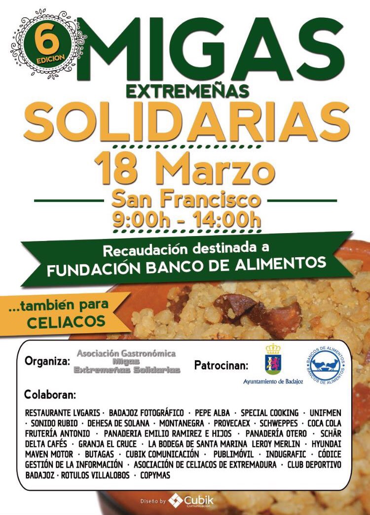 Códice colabora en la 6ª edición de las “Migas Extremeñas Solidarias”, que tendrá lugar en el Paseo de San Francisco de Badajoz el próximo sábado día 18 de marzo de 9 a 14 horas. La actividad que organizamos consistirá en un taller de cuenta cuentos para los más pequeños a partir de las 11:30. Toda la recaudación estará destinada a la Fundación Banco de Alimentos. Os esperamos.