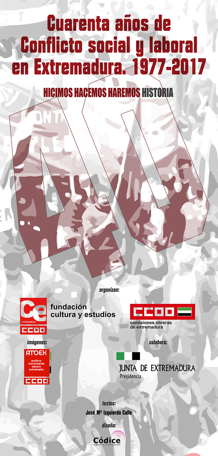 Códice diseña la exposición «Cuarenta años de conflicto social y laboral en Extremadura. 1977-2017», producida y organizada por la Fundación Cultura y Estudios de CCOO con el apoyo de la Junta de Extremadura y CCOO de Extremadura. La exposición, presentada en paneles de gran tamaño y en formato libro, pretende resumir de manera visual el conflicto laboral y social en Extremadura en los últimos 40 años y reivindicar a los trabajadores extremeños como sujetos activos en la lucha por sus derechos. Para elaborar la exposición se ha realizado una selección de imágenes provenientes de los fondos fotográficos del Archivo del Movimiento Obrero Extremeño. Fue inaugurada en Mérida, durante el X Congreso de CCOO de Extremadura, los días 18 y 19 de mayo pasados.
