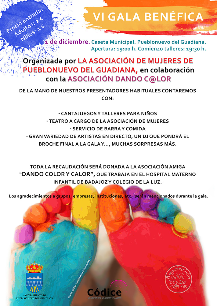 Como viene siendo habitual, Códice colabora en la VI Gala Benéfica que organiza la Asociación de Mujeres de Pueblonuevo del Guadiana y la Asociación Dando C@lor que tendrá lugar en Puebonuevo del Guadiana el próximo 1 de diciembre. Toda la recaudación se destinará a la Asociación Dando C@lor (www. dandocolorycalor.org) que trabaja atendiendo a niños de oncología infantil en el Hospital Materno Infantil de Badajoz. Desde Códice queremos ensalzar el valor humano de todos los voluntarios y voluntarias que dedican su tiempo y esfuerzo para aportar un poco de alegría y felicidad a los niños y familiares que les ayude a superar tan duros momentos. Os invitamos a que asistáis.