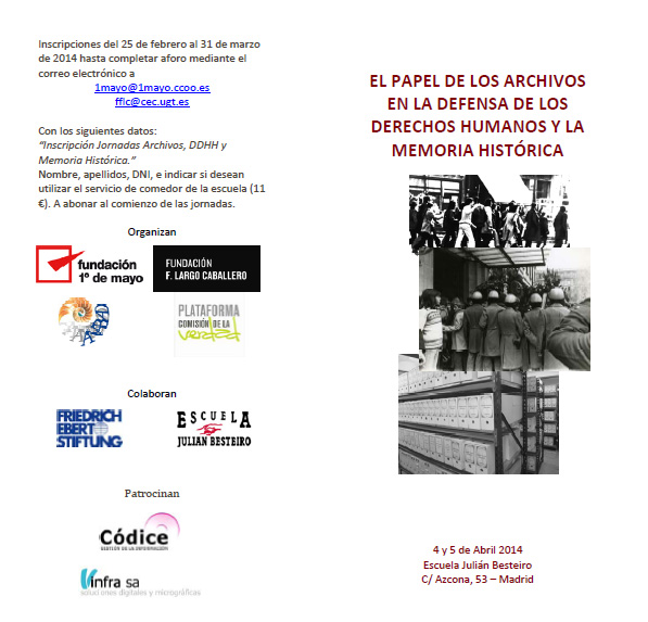 Códice patrocina las jornadas «El papel de los archivos en la defensa de los derechos humanos y memoria histórica», organizado por ANABAD, Fundación 1º de Mayo, Fundación Largo Caballero y Plataforma Comisión de la Verdad. Se celebrará en Madrid los días 4 y 5 de abril.