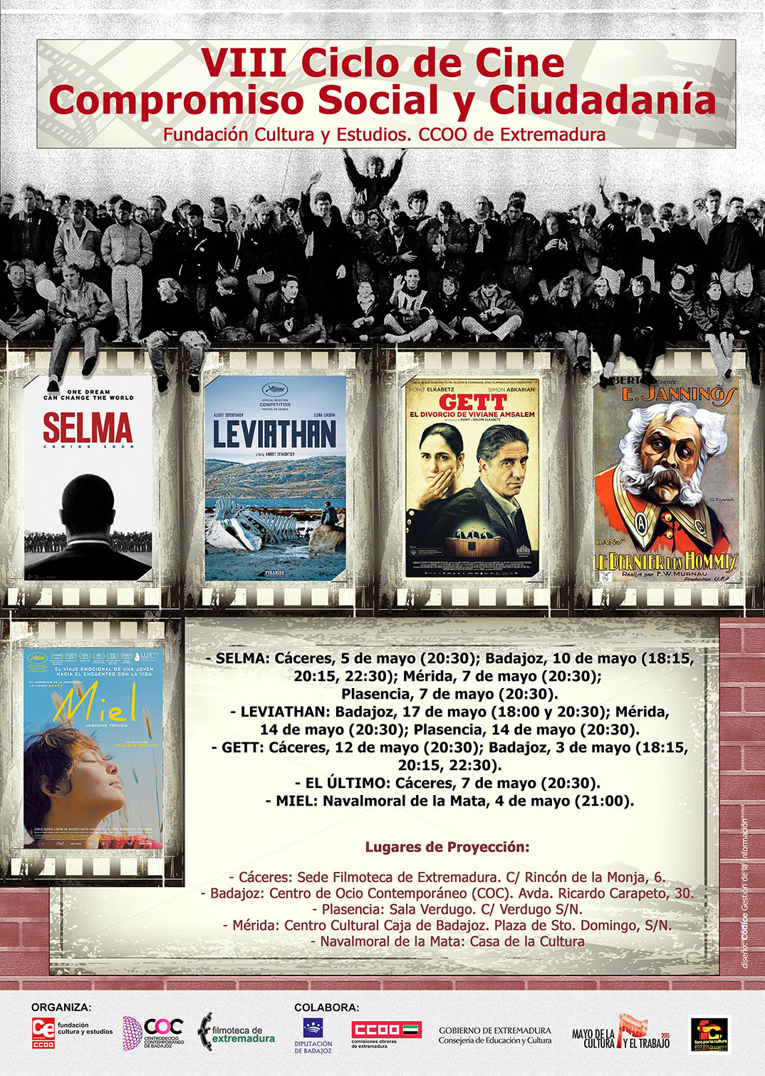 Como cada año, Códice diseña el cartel de la programación del VIII Ciclo de Cine «Compromiso Social y Ciudadanía», organizado por la Fundación Cultura y Estudios de CC.OO. de Extremadura. Las películas se emiten en Badajoz, Caceres, Mérida, Plasencia y Navalmoral de la Mata desde el 3 hasta el 17 de mayo.